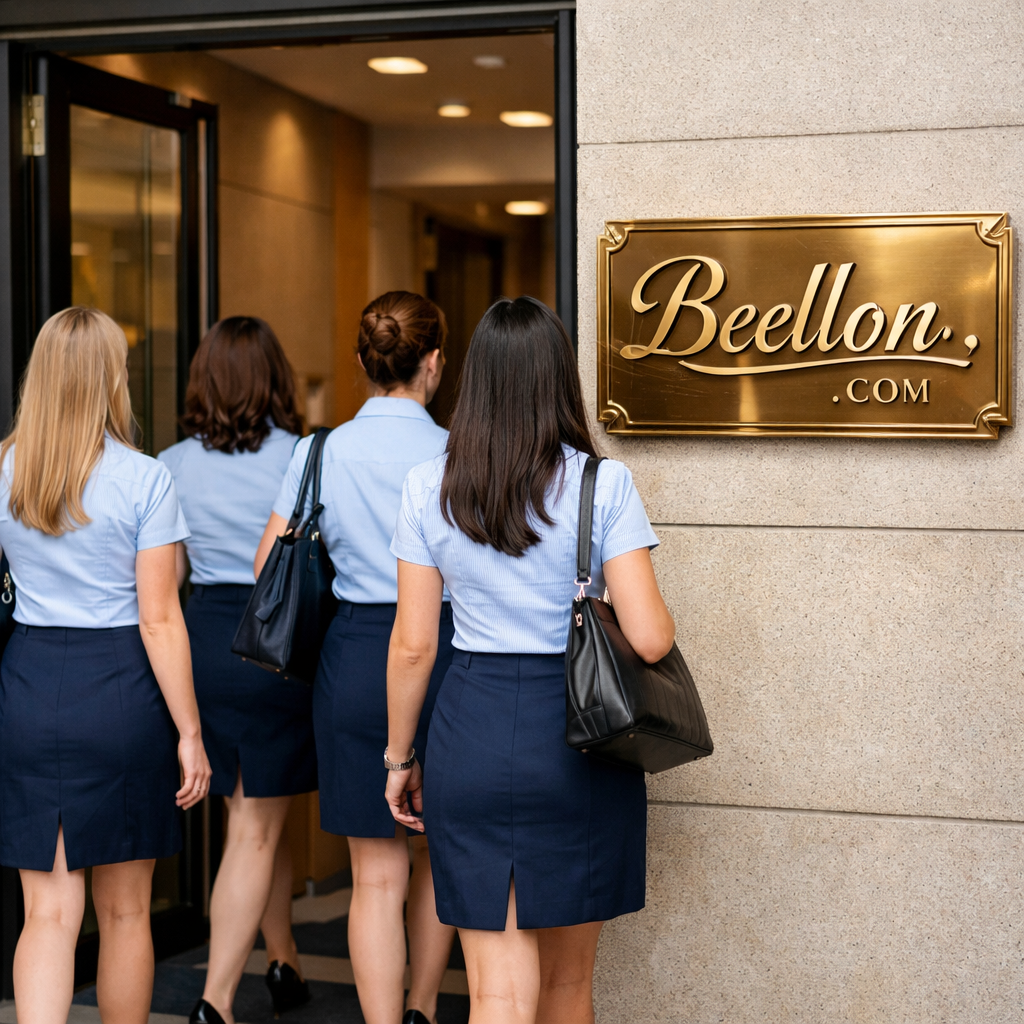 genera una imagen de un grupo de mujeres con convarta y faltas uniforme formal azull de verano y entrando a una empresa que tiene un aviso lujoso de bronce que dice Beellon.com