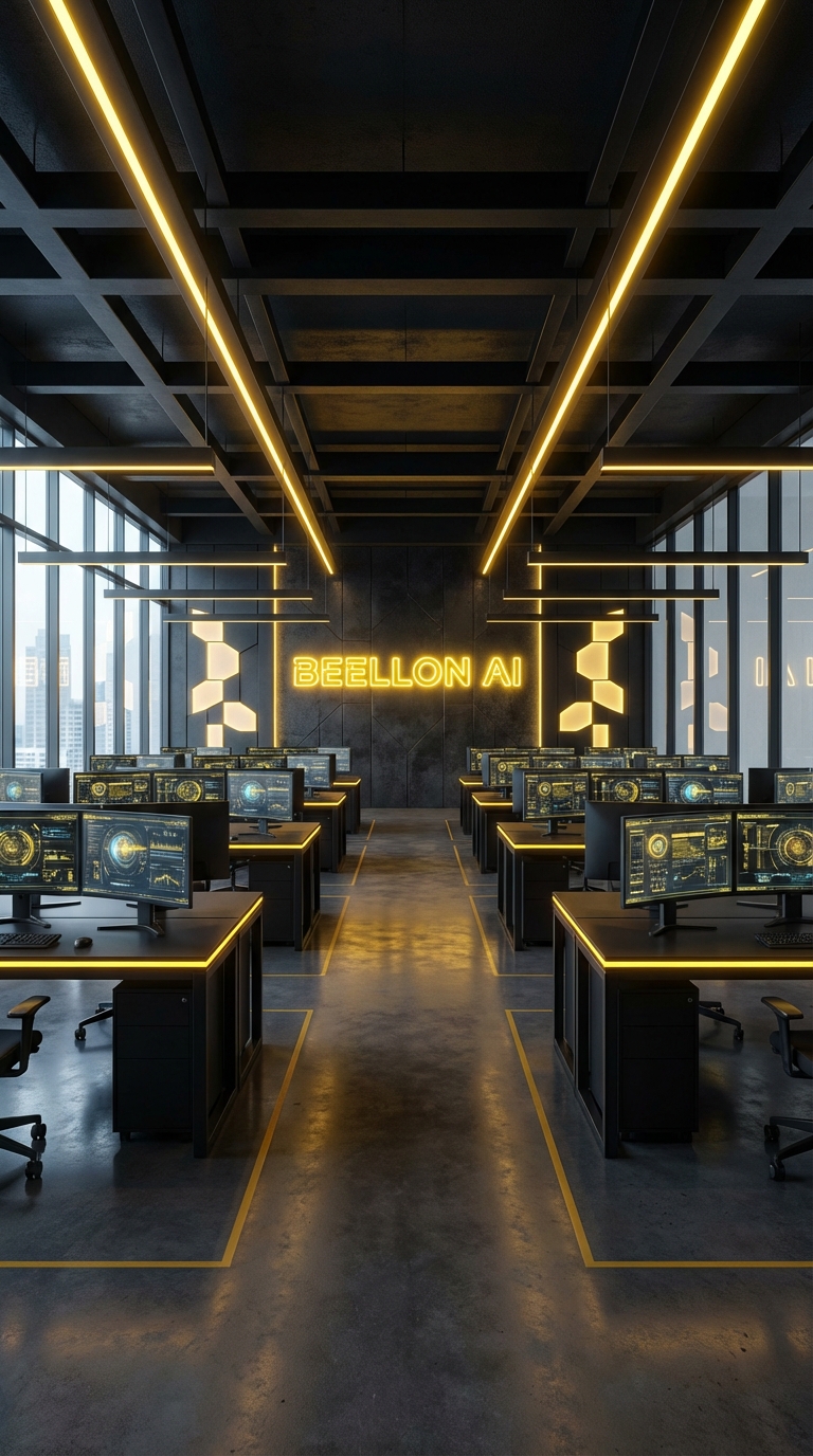 High-tech, sleek open-plan office, Beellon AI corporate headquarters. The space is expansive with numerous modern black desks, each equipped with multiple large monitors displaying futuristic interfaces. Dominant colors are striking yellow and deep black, with strategic use of bright yellow LED strips and glowing accents on the desks and ceiling. In the background, a large, vibrant neon sign spells out 'BEELLON AI' in intense yellow light, casting a subtle glow. The overall atmosphere is futuristic, professional, and energetic, with clean lines and sharp contrasts. No people, no clutter.
