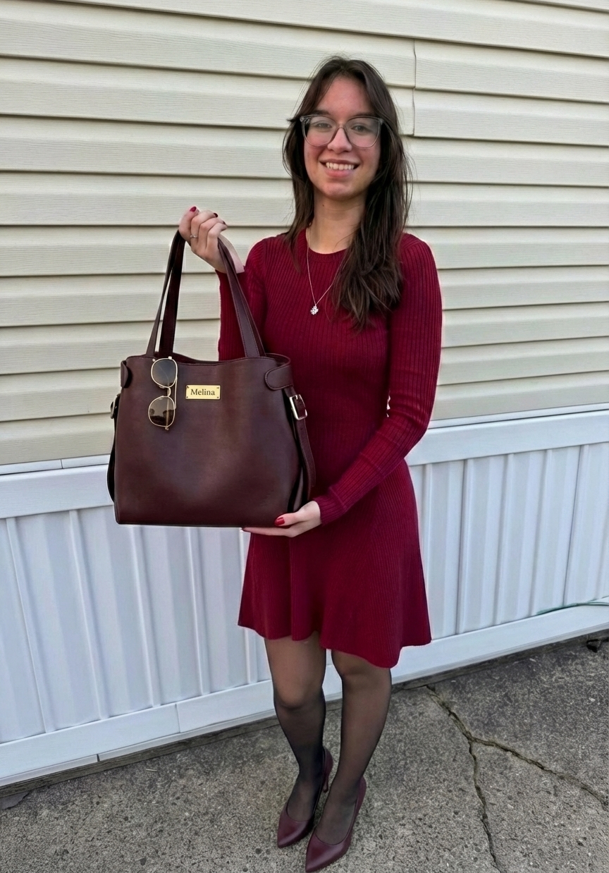 agrega una marca en la cartera que diga Melina que sea de metal dorado y agrega una gafas de sol