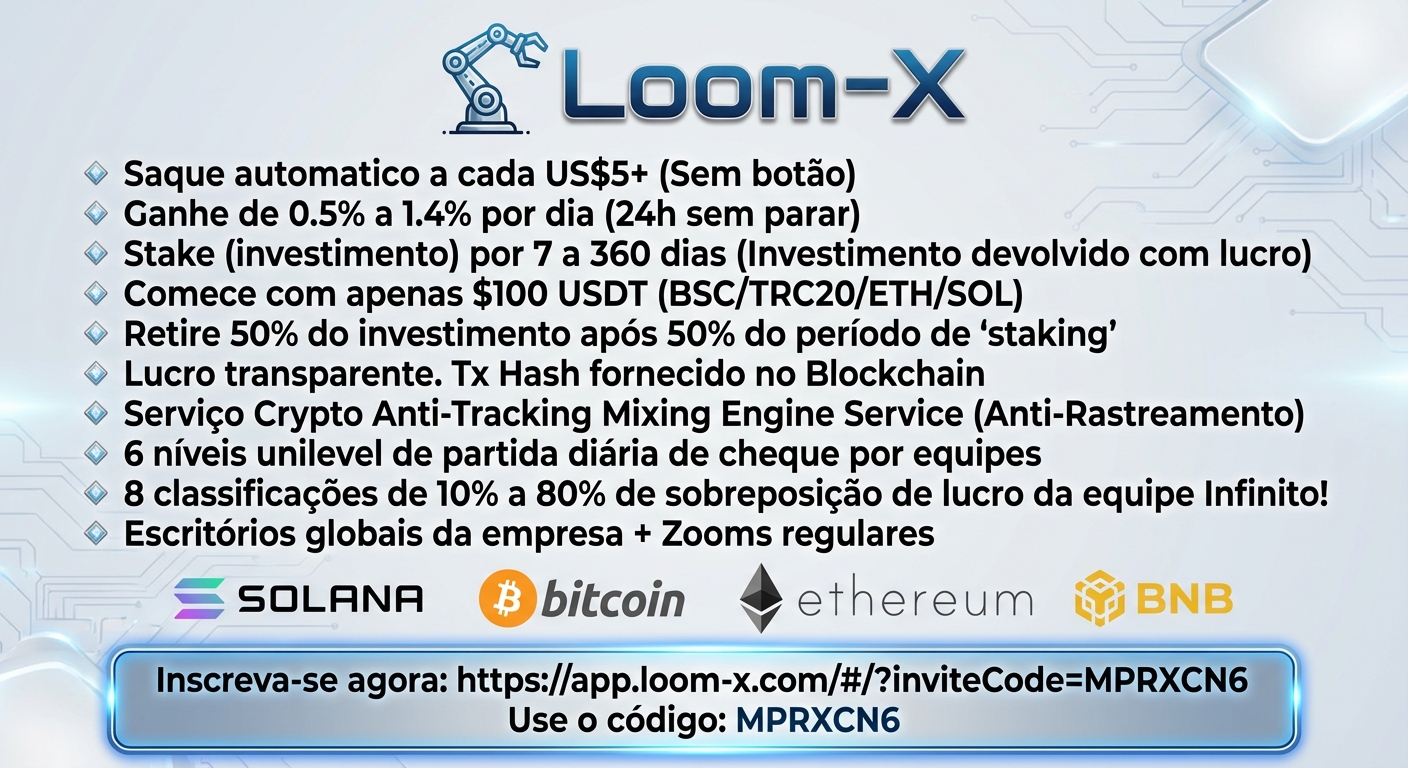 Faça uma imagem para convidar as pessoas para investir no robô de negociações chamado 'Loom-X'. Com os seguintes benefíc...