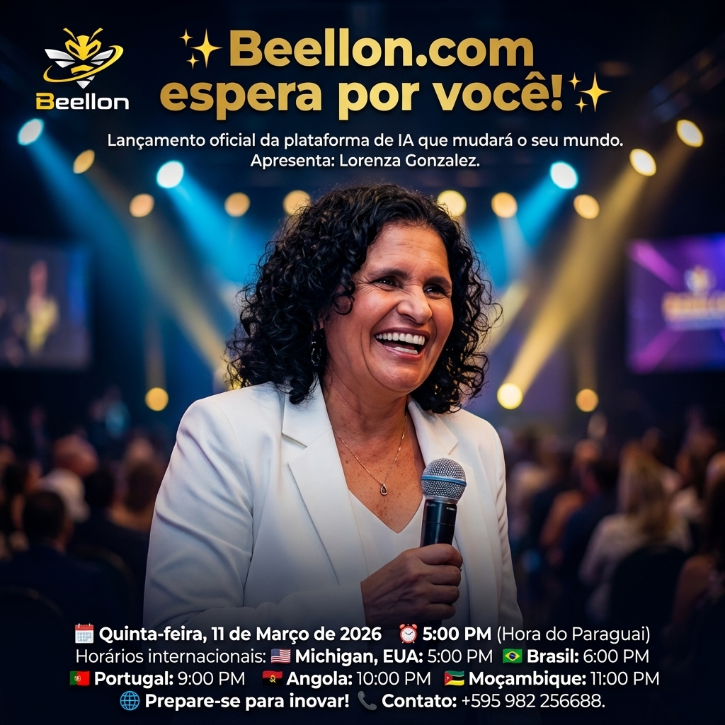 ✨ **Beellon.com espera por você!** ✨ Lançamento oficial da plataforma de IA que mudará o seu mundo. Apresenta: Lorenza Gonzalez. 🗓️ **Quinta-feira, 11 de Março de 2026** ⏰ **5:00 PM** (Hora do Paraguai) Horários internacionais: 🇺🇸 **Michigan, EUA:** 5:00 PM 🇧🇷 **Brasil:** 6:00 PM 🇵🇹 **Portugal:** 9:00 PM 🇦🇴 **Angola:** 10:00 PM 🇲🇿 **Moçambique:** 11:00 PM 🌐 **Prepare-se para inovar!** 📞 Contato: +595 982 256688.