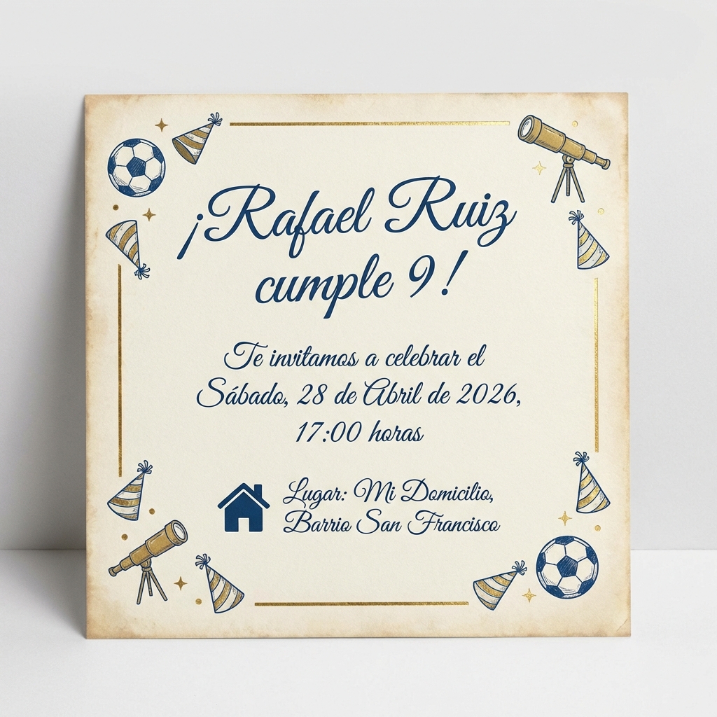 Crear una invitación para el cumpleaños no. 9 de Rafael Ruiz ,el dia 28 de Abril de 2026 a las 17:00 hras...A realizarse en mi domicilio ..BarriobSan Francisco
