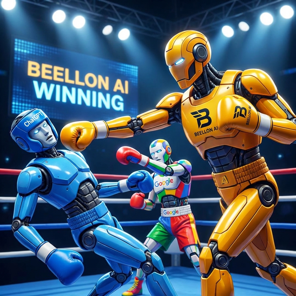Genera una imagen de beellon.com peleando con chatgpt con guantes y Google con guantes haga que las 3 AI estén juntas y que Bellon Ai esté ganando la pelea adjunte el logo de beellon AI