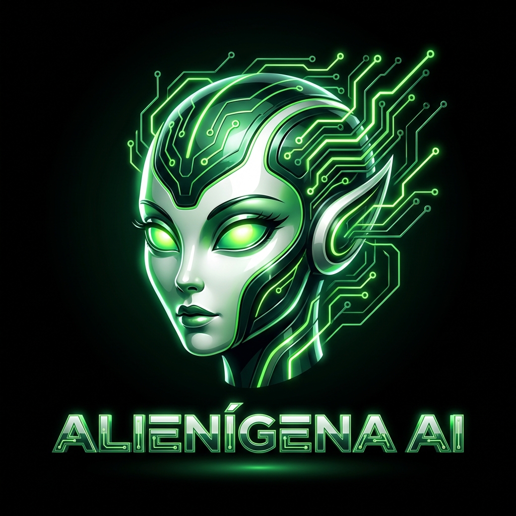 Logo profesional para canal de YouTube "Alienígena AI". Icono de cabeza de alienígena femenina estilizada, rasgos suaves y elegantes, pestañas sutiles, expresión serena y poderosa. Líneas de circuito electrónico saliendo de la cabeza. Ojos grandes almendrados brillantes. Colores: verde neón vibrante como color principal, acentos en verde esmeralda oscuro y blanco puro. Fondo negro puro. El texto "ALIENÍGENA AI" en tipografía futurista geométrica debajo del icono. Diseño limpio, tech, apto para avatar circular de YouTube.