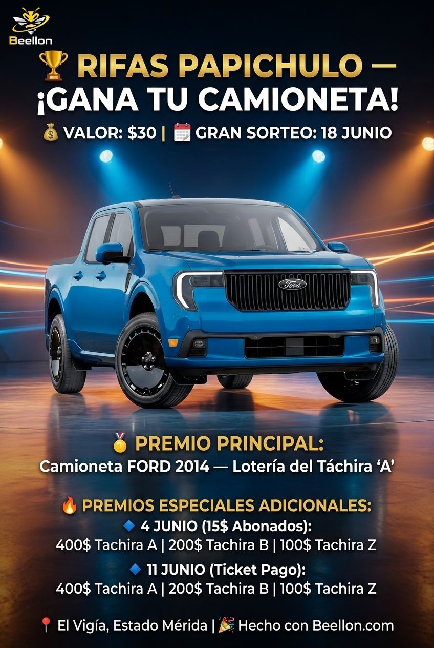 🏆 RIFAS PAPICHULO — ¡GANA TU CAMIONETA! 💰 VALOR: $30 📅 GRAN SORTEO: 18 JUNIO 🥇 PREMIO PRINCIPAL: Camioneta FORD 2014 — Lotería del Táchira "A" 🔥 PREMIOS ESPECIALES ADICIONALES: 🔹 4 JUNIO (15$ Abonados): 400$ Tachira A | 200$ Tachira B | 100$ Tachira Z 🔹 11 JUNIO (Ticket Pago): 400$ Tachira A | 200$ Tachira B | 100$ Tachira Z 📍 El Vigía, Estado Mérida 🎉 Hecho con Beellon.com