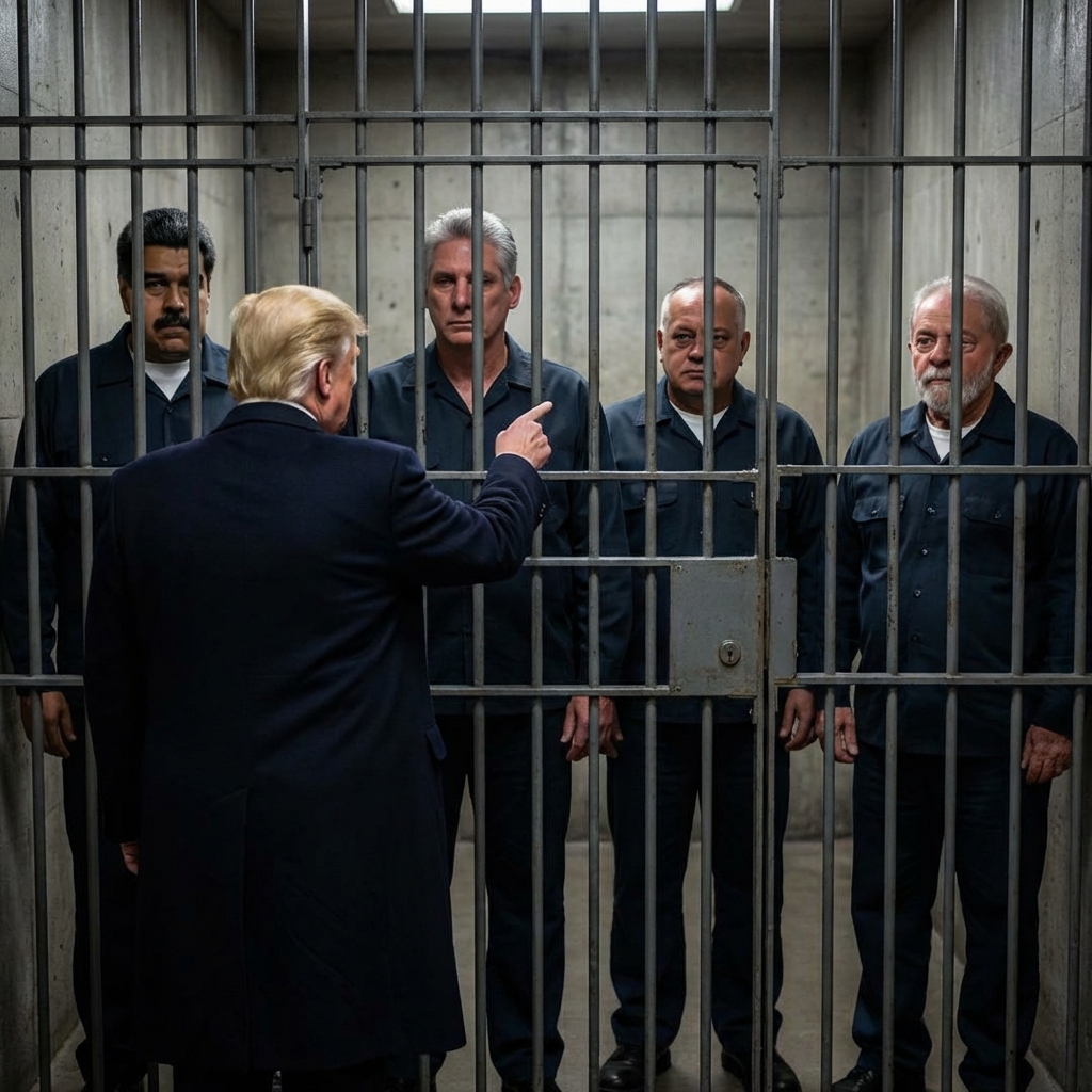Genera una imagen del expresidente Maduro, Díaz-Canel, Diosdado Cabello, Lula da Silva tras las rejas de la cárcel de Nueva York, con caras muy serias y así como asustados y Donald Trump mirándolos y señalando, a Diaz canel