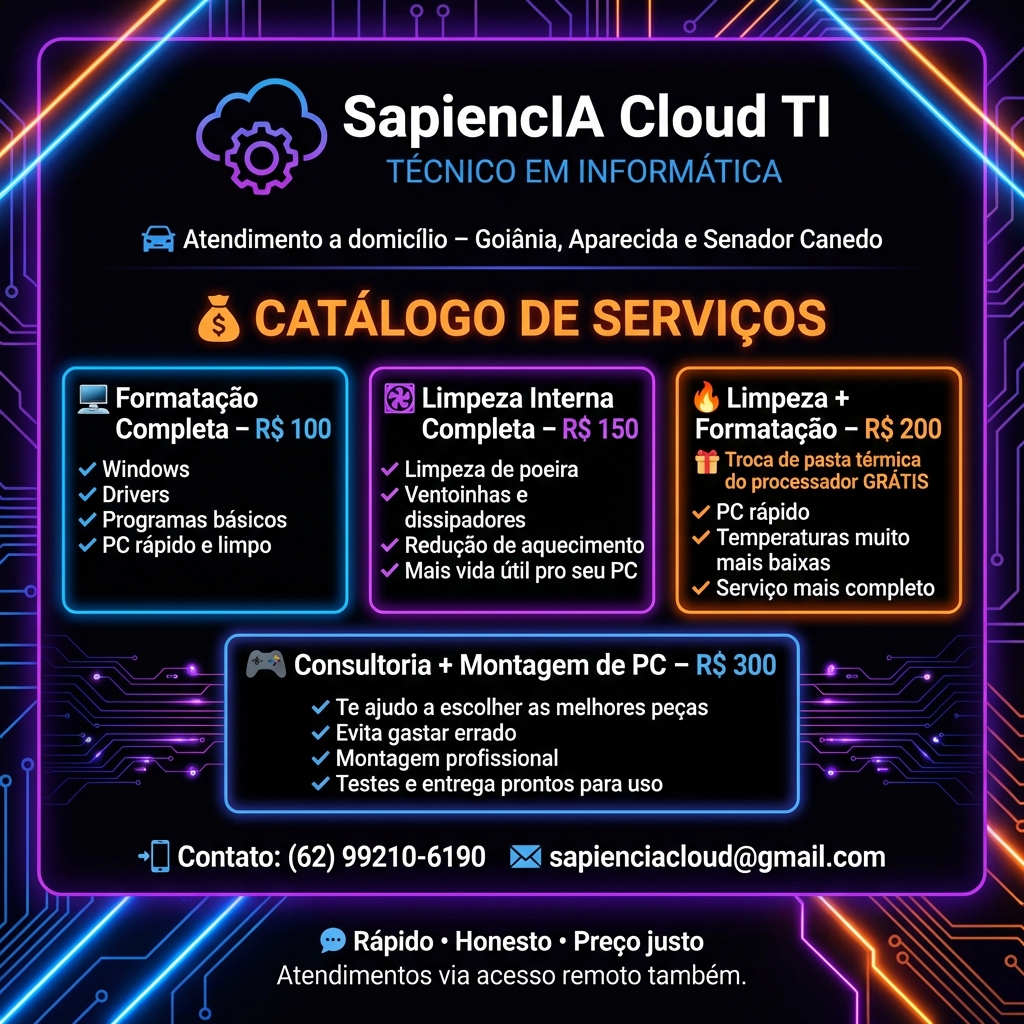 Crie um flyer para meu serviço de manutenção de computadores, etc. Quero algo moderno, simples e bonito. Com cores em fundo preto cores como 'roxo', 'laranja' e azul. Algo que chame atenção do cliente e faça ele vir falar comigo. Com os seguintes dados:.