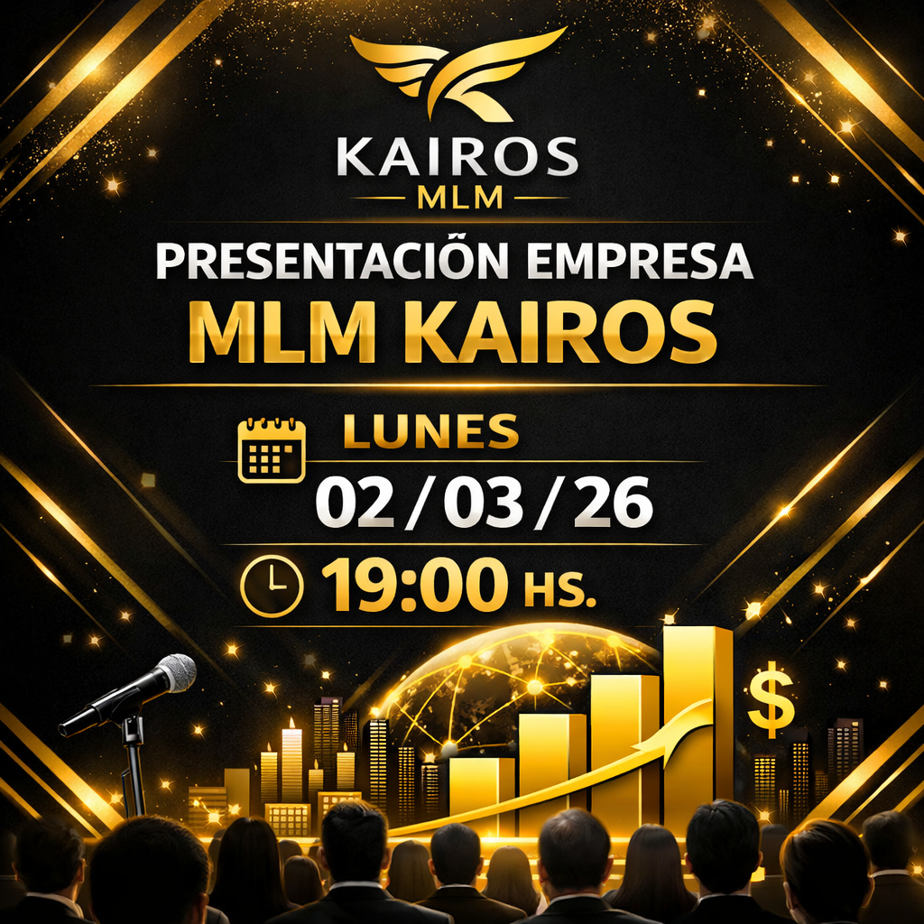 genera imagen para una reunion el dia Lunes 02/03/26 hora 19:00 hs. Presentacion Empresa MLM Kairos., Colores que deberas utilizar Negro Blanco Amarillo ORO