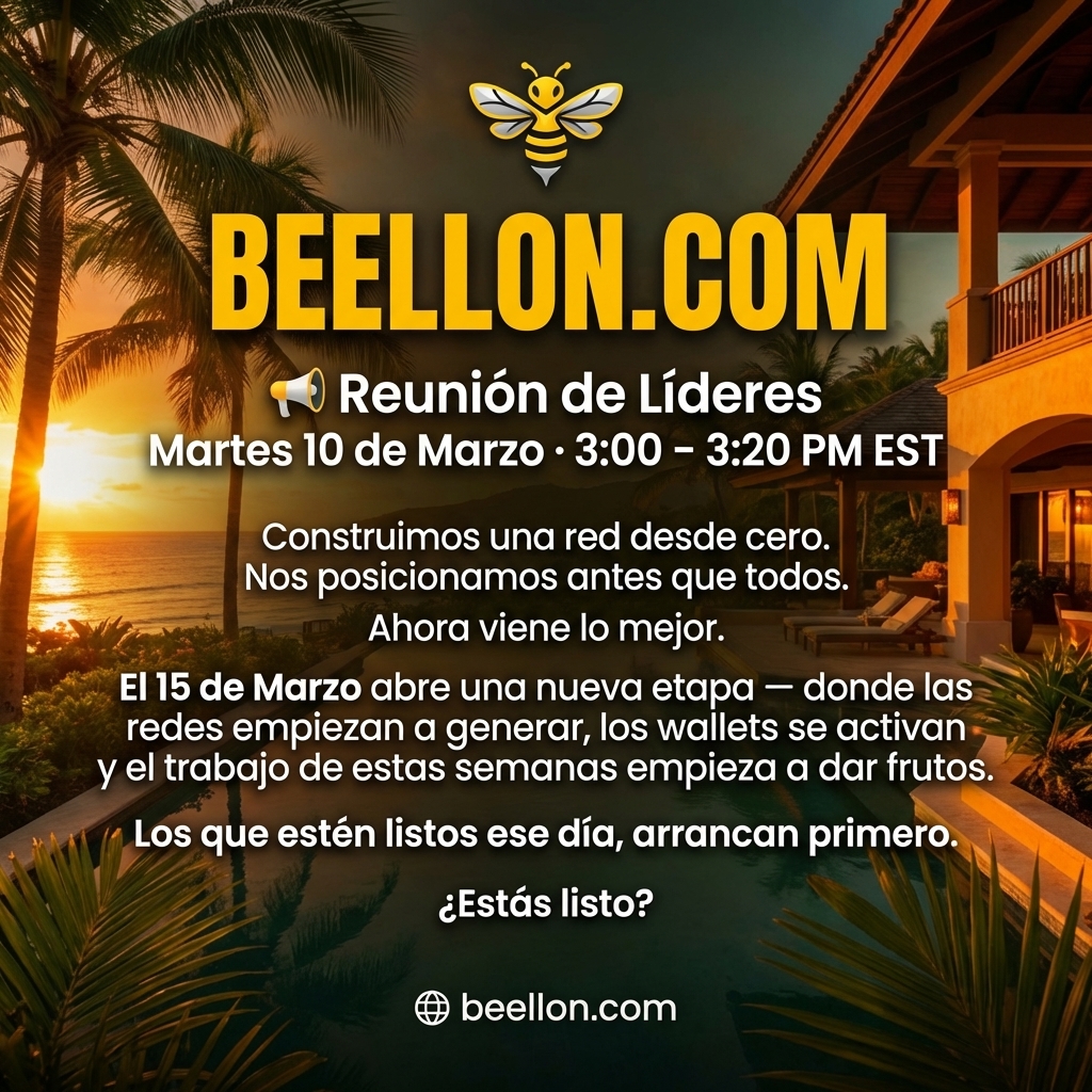 BEELLON.COM 📢 Reunión de Líderes Martes 10 de Marzo · 3:00 – 3:20 PM EST Construimos una red desde cero. Nos posicionamos antes que todos. Ahora viene lo mejor. El 15 de Marzo abre una nueva etapa — donde las redes empiezan a generar, los wallets se activan y el trabajo de estas semanas empieza a dar frutos. Los que estén listos ese día, arrancan primero. ¿Estás listo? 🌐 beellon.com
